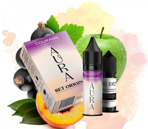 Набір сольової рідини Aura Original Courage — це чудове поєднання свіжого яблука, соковитого персика та насиченої чорної смородини, яке подарує вам справжнє задоволення з кожною затяжкою. Цей мікс вражає своєю гармонією смаків: яблуко приносить легкість і свіжість, персик додає солодощі, а чорна смородина підкреслює всі відтінки, надаючи компотному смаку особливої глибини.