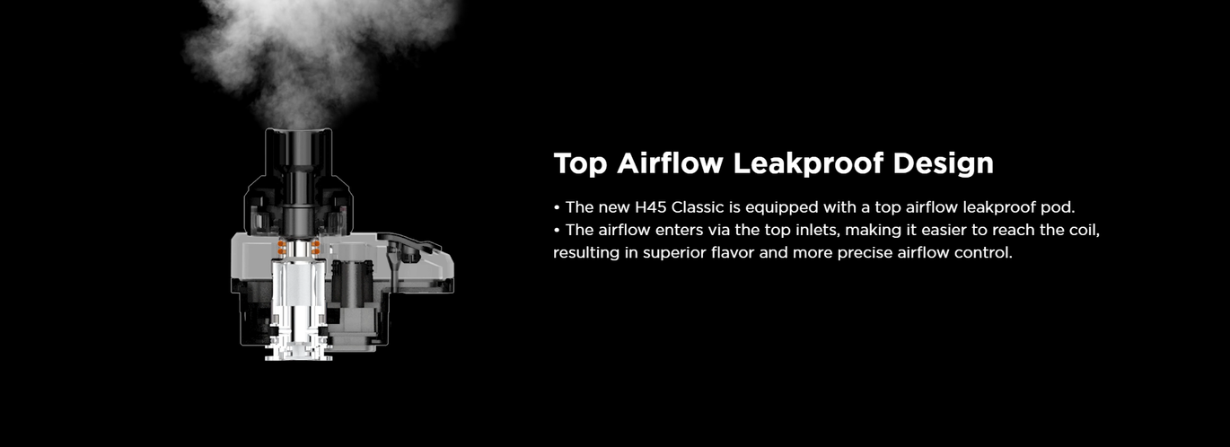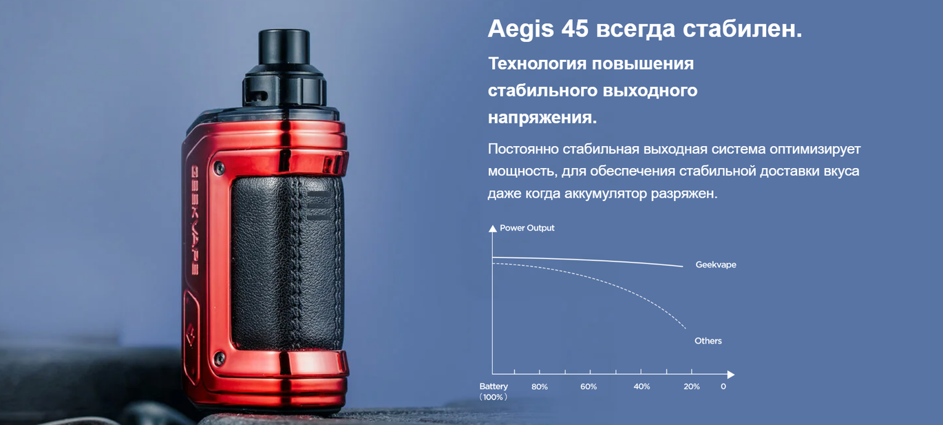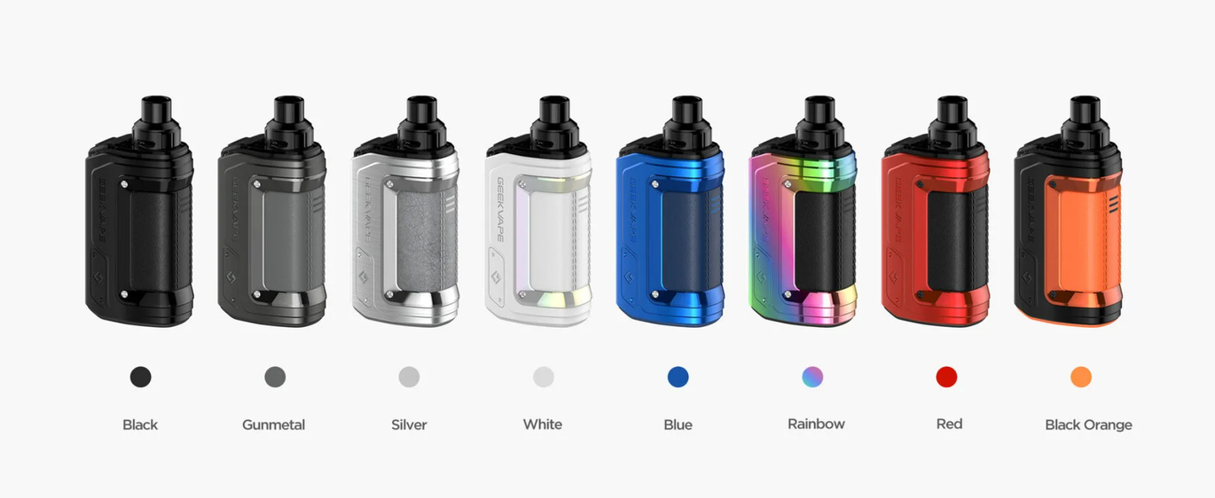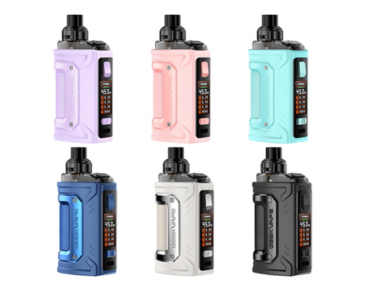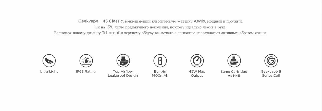 GeekVape H45 вирізняється міцним корпусом із силіконовим покриттям та вставками зі штучної шкіри, що робить його на 15% легшим за попередні моделі. Пристрій оснащений оновленою технологією Tri-proof із рейтингом IP68, що забезпечує захист від води, пилу та ударів. Герметичний дизайн із верхнім повітряним потоком запобігає протіканню та покращує передачу смаку.