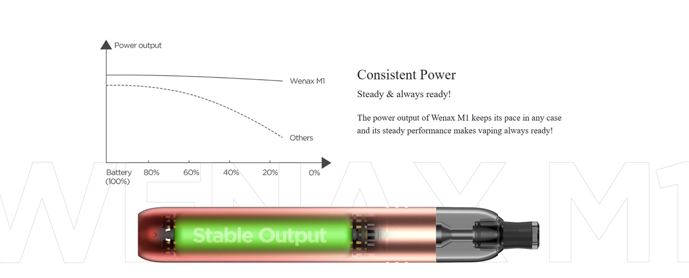 Geekvape Wenax M1 поєднує простоту використання, високу якість виконання та сучасні технології. Завдяки невеликій вазі та ергономічному дизайну цей аксесуар стане вашим надійним супутником у будь-якій ситуації. Гаджет має зручну автоматичну активацію від затяжки, що дозволяє насолоджуватися парінням без зайвих рухів. Його картриджі на сітчастих випарниках гарантують відмінну передачу смаку.