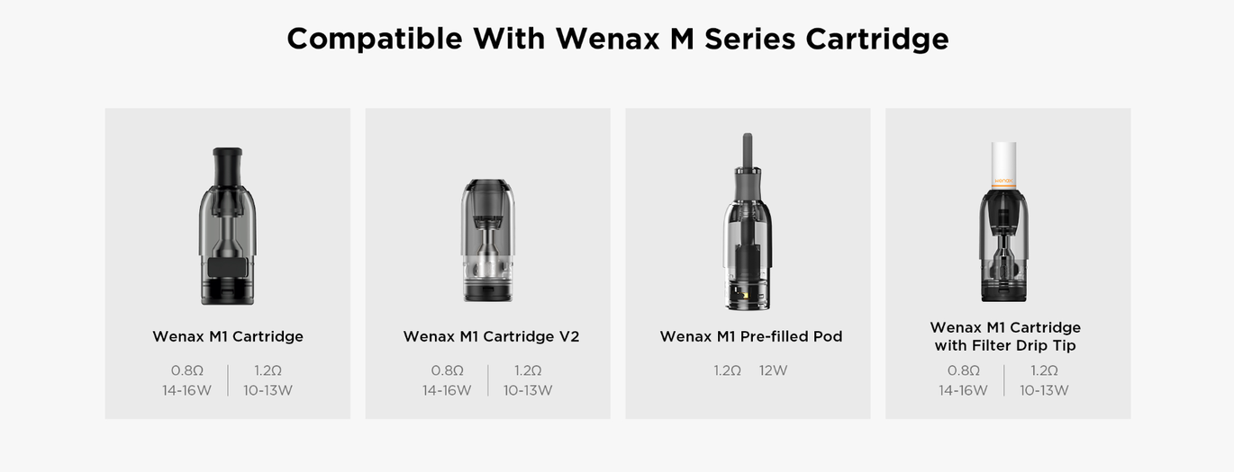 Geekvape Wenax M1 використовує вбудовані сітчасті випарники опором 0.8 Ом та 1.2 Ом. Завдяки сучасній технології, картриджі забезпечують чудову смакопередачу. Об’єм резервуара становить 2 мл, що дозволяє комфортно використовувати гаджет протягом дня без частого дозаправлення.
