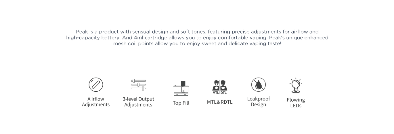 Peak розроблений з акцентом на зручність використання та універсальність. Завдяки сучасному чипсету пристрій забезпечує стабільну подачу потужності незалежно від рівня заряду акумулятора. Надійний захист корпусу дозволяє використовувати pod-систему у будь-яких умовах.