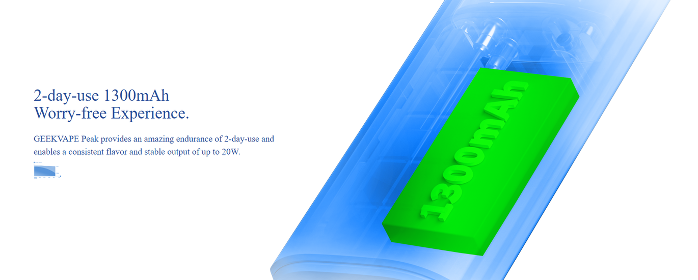 Geekvape Peak оснащений ємним акумулятором на 1800 мАг, який забезпечує тривалий час роботи без необхідності частої зарядки. Зарядний порт USB Type-C підтримує функцію швидкої зарядки, дозволяючи повністю зарядити пристрій лише за 50 хвилин.