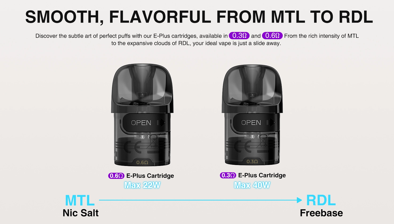 Картриджі забезпечують чудову передачу смаку та тривалий термін служби. Для користувачів, які віддають перевагу самостійній намотці, доступний окремо придбаний картридж E Plus RBA.