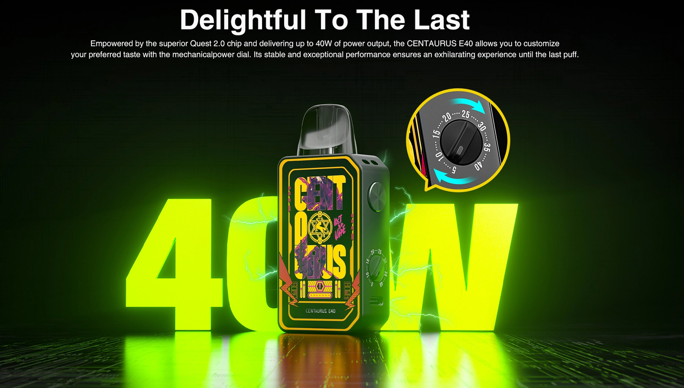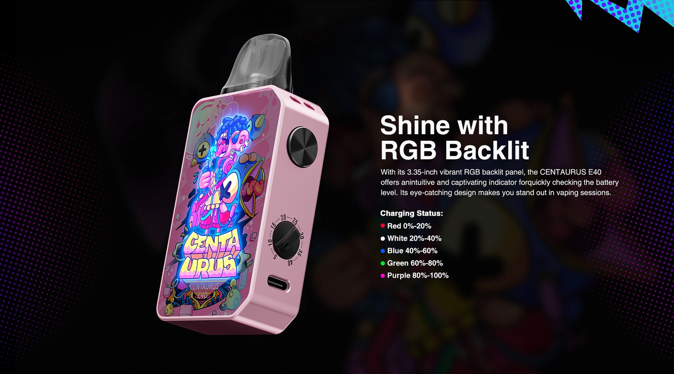 Centaurus E40 має компактний та ергономічний корпус розмірами 20х43,3х95 мм, виготовлений з алюмінієвого сплаву та полікарбонату. Його дизайн вирізняється 3,35-дюймовою панеллю з RGB-підсвіткою, яка не лише додає естетичної привабливості, але й інформує про стан акумулятора. Елементи управління, такі як кнопка активації та регулятор потужності, розташовані на бічній стороні для зручного доступу.