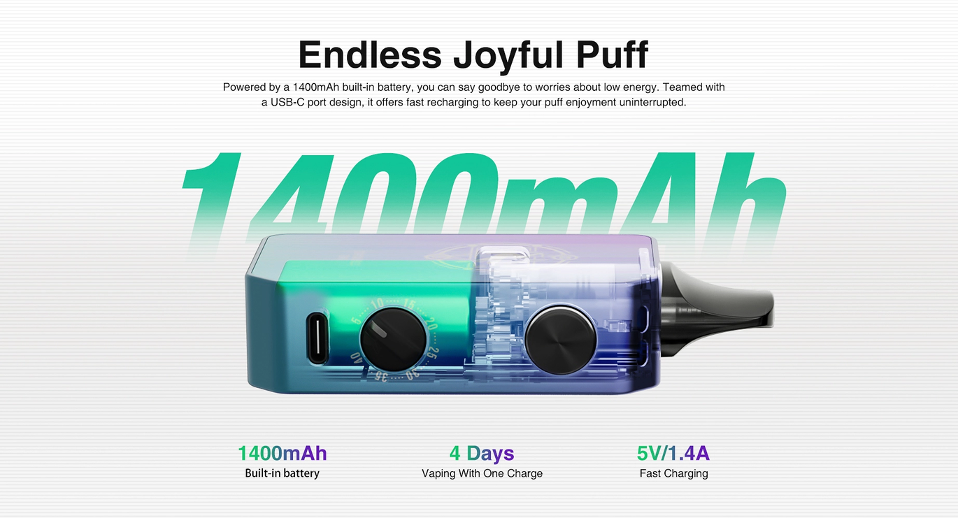 Вбудований акумулятор ємністю 1400 мАг забезпечує тривалу роботу Lost Vape Centaurus E40. Зарядка здійснюється через порт Type-C з силою струму 1,4 А, що дозволяє швидко відновити повний заряд. Виробник зазначає, що одного заряду може вистачити на декілька днів використання, залежно від інтенсивності вейпінгу та налаштувань потужності.
