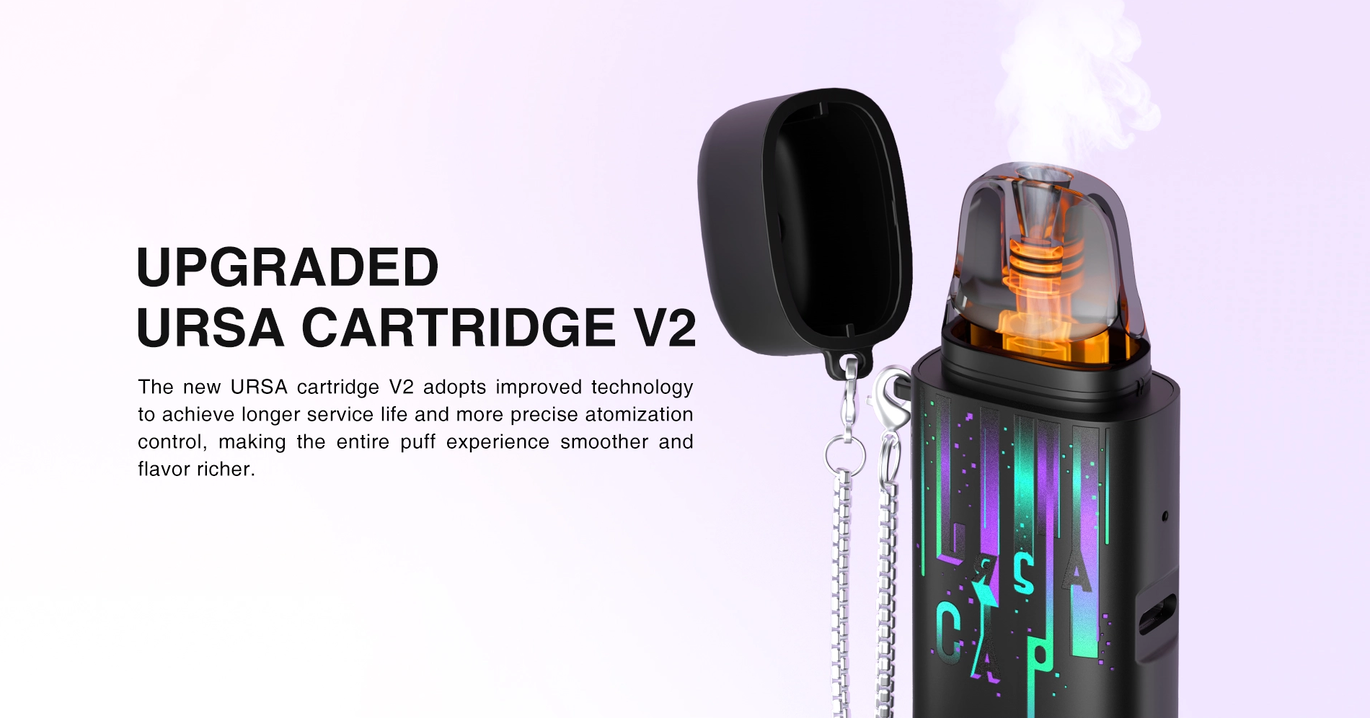 Lost Vape Ursa Cap сумісний із картриджами серії Ursa V2, об'ємом 2,5 мл. Картриджі оснащені вбудованими випарниками з опором 0,8 Ом, що забезпечує насичений смак та оптимальну кількість пари. Бічна система заправки та герметичний дизайн мінімізують ризик протікань, а регульований повітряний потік дозволяє налаштувати затяжку відповідно до особистих вподобань — від MTL до RDL.