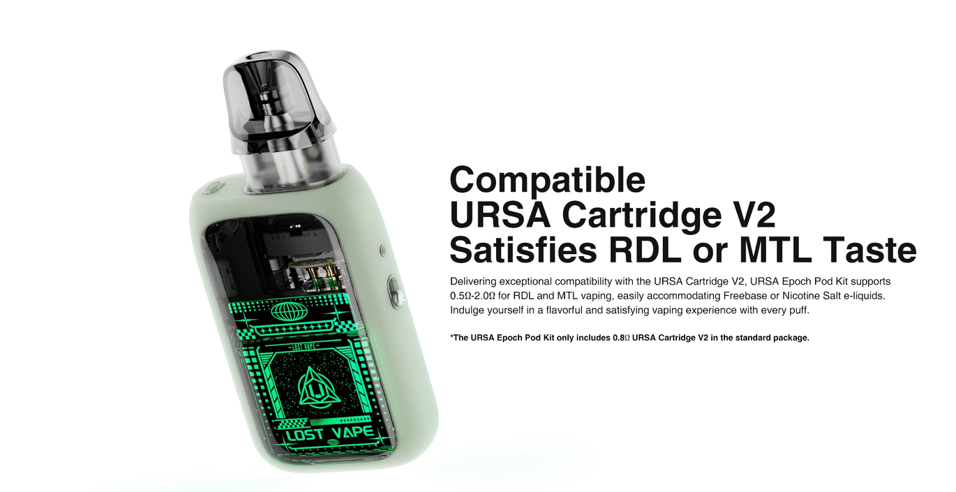 Lost Vape Ursa Epoch сумісний із картриджами серії Ursa V2, об'ємом 2,5 мл. Картриджі оснащені вбудованими випарниками з опором 0,8 Ом, що забезпечує насичений смак та оптимальну кількість пари. Бічна система заправки та герметичний дизайн мінімізують ризик протікань, а регульований повітряний потік дозволяє налаштувати затяжку відповідно до особистих вподобань — від MTL до RDL.