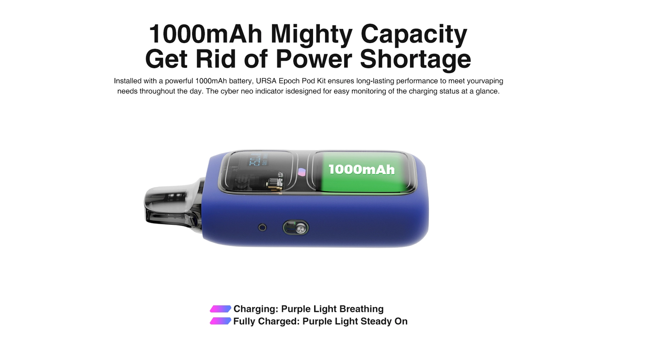 Ursa Epoch обладнаний вбудованим акумулятором ємністю 1000 мАг, що забезпечує стабільну роботу протягом дня. Підтримується швидка зарядка через порт USB Type-C з силою струму 1 А, що дозволяє швидко відновити заряд та продовжити використання без значних перерв. Функція регулювання потужності в діапазоні від 17 Вт до 25 Вт дозволяє налаштувати пристрій відповідно до особистих вподобань та обраного стилю паріння.