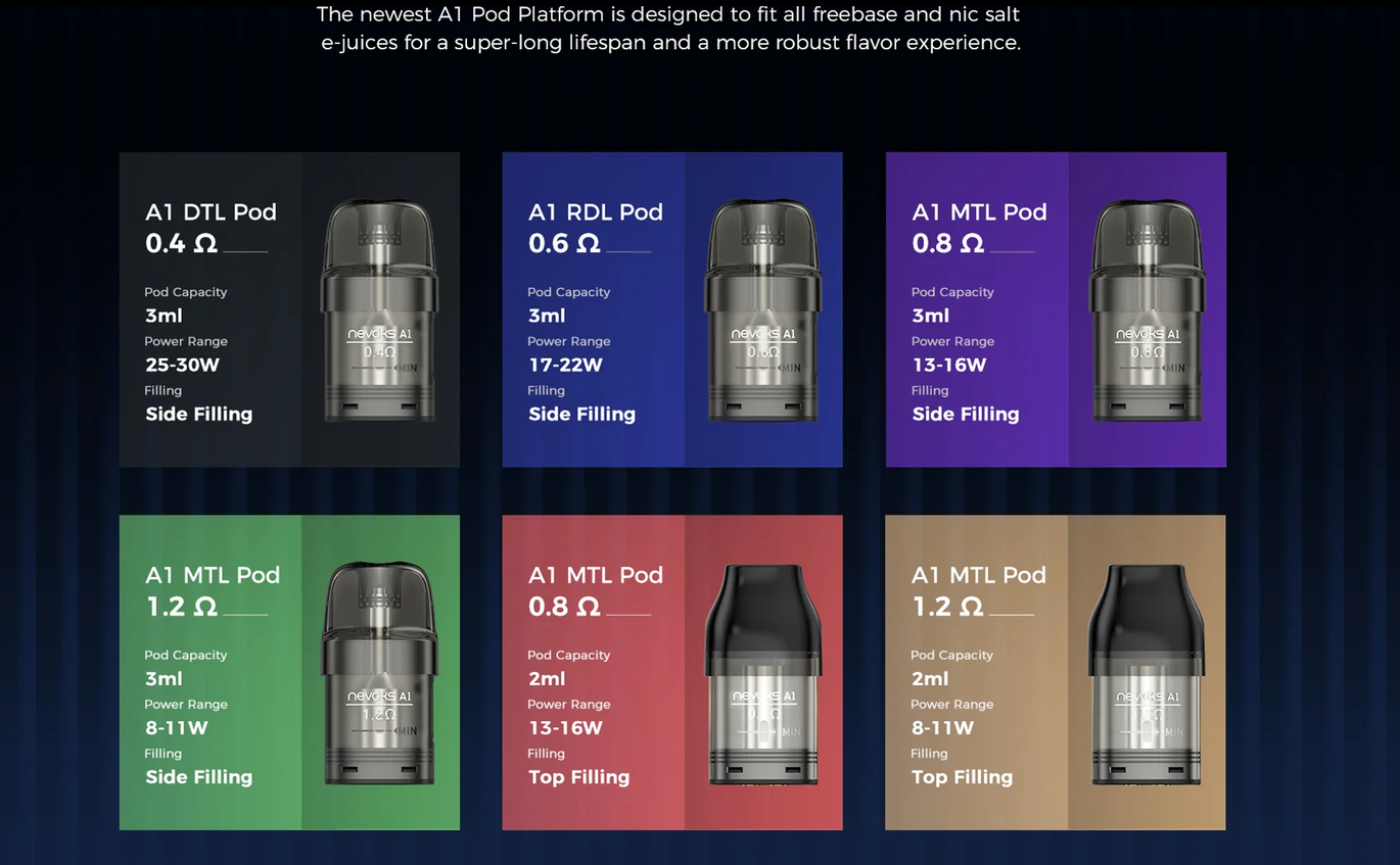 Feelin A1 використовує змінні картриджі ємністю 3 мл (2 мл для TPD-регульованих ринків) та сумісний з випарниками з опором 0,4 Ом, 0,6 Ом, 0,8 Ом та 1,2 Ом. Це забезпечує насичений смак та можливість налаштування під індивідуальні вподобання користувача. Картриджі доступні у двох варіантах: з боковим заповненням (3 мл) та верхнім заповненням (2 мл), що додає зручності у використанні.