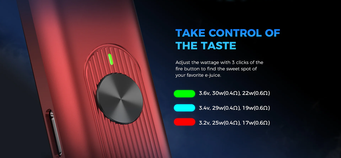 Гаджет оснащений світлодіодним індикатором, розташованим над кнопкою активації, який відображає рівень потужності та стан заряду батареї. Три натискання на кнопку дозволяють перемикатися між трьома рівнями потужності: