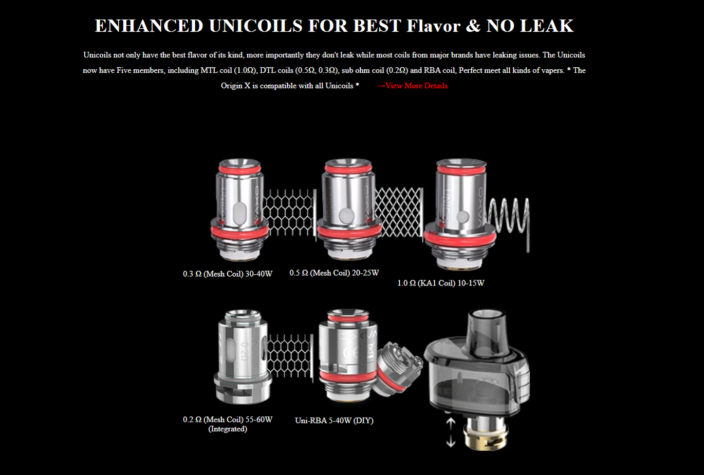 Девайс використовує змінні картриджі об'ємом 3 мл (2 мл для TPD-регіонів) з нижнім заповненням. Oxva Origin X сумісний із серією випарників Unicoil, що включає: