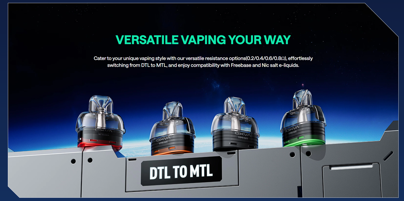 Девайс Oxva VPRIME використовує картриджі об'ємом 5 мл (2 мл для TPD-регіонів) з верхнім заповненням, що створює зручність та мінімізує ризик протікань. Под-мод Oxva VPRIME сумісний із серією випарників Unitech 2.0, які забезпечують на 50% кращу передачу смаку, на 45% більше виробництво пари та на 30% довший термін служби випарника. Доступні опції опору: 0,2Ω, 0,4Ω, 0,6Ω та 0,8Ω, що дозволяє налаштувати пристрій під різні стилі вейпінгу — від DTL до MTL.