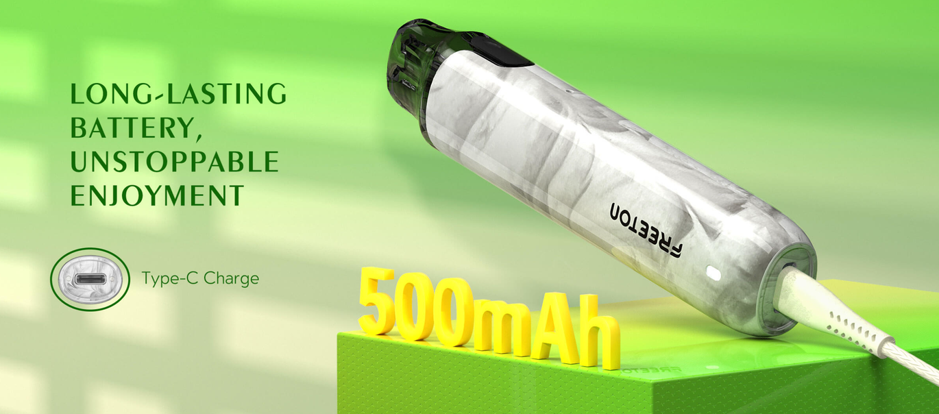 Гаджет оснащений вбудованою літій-іонною батареєю ємністю 500 мАг, що забезпечує до 1800 затяжок на одному заряді. Зарядка здійснюється через порт USB Type-C, що забезпечує швидке та зручне відновлення заряду.