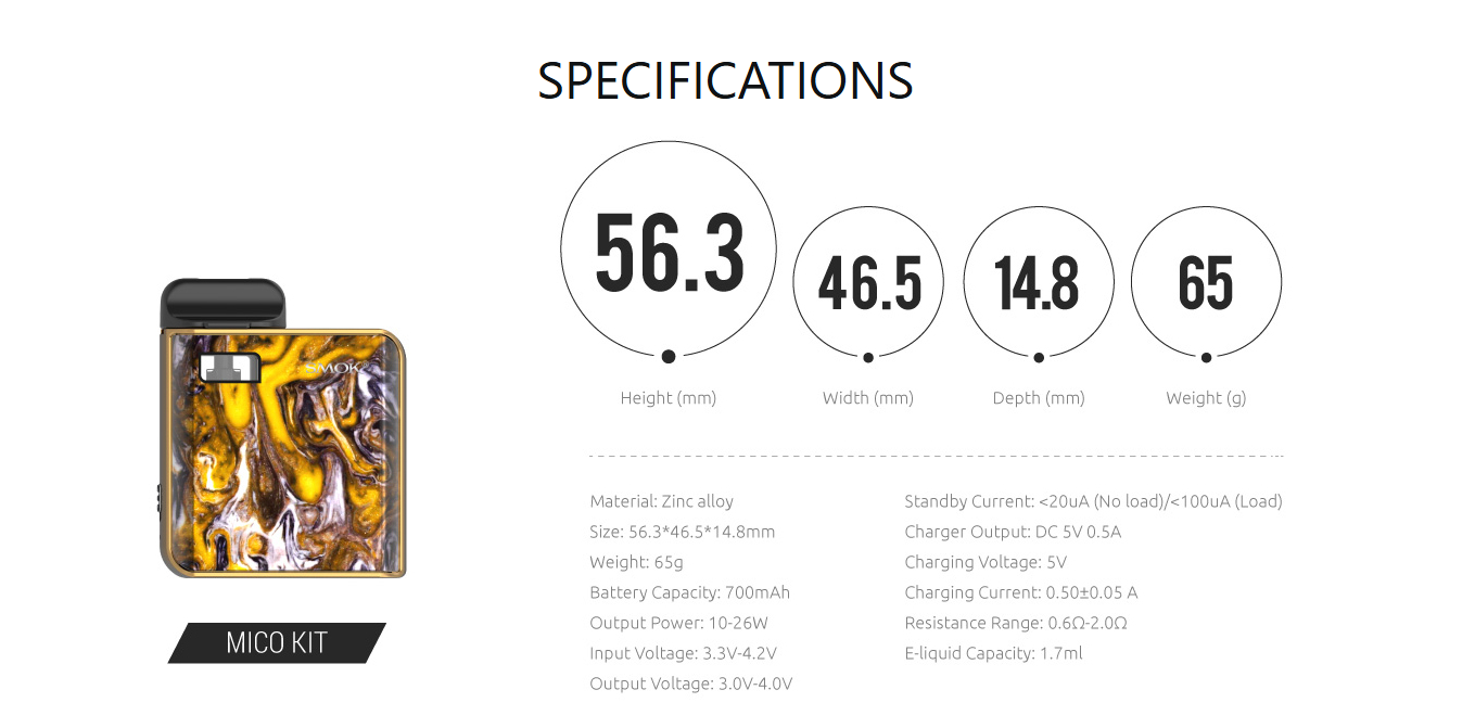 Smok Mico має унікальний дизайн з високоякісним смоляним покриттям, що надає пристрою преміальний вигляд. Компактний корпус із закругленими краями зручно лежить у руці, а невеликі розміри (56,3 мм × 46,5 мм × 14,8 мм) дозволяють легко носити пристрій у кишені.