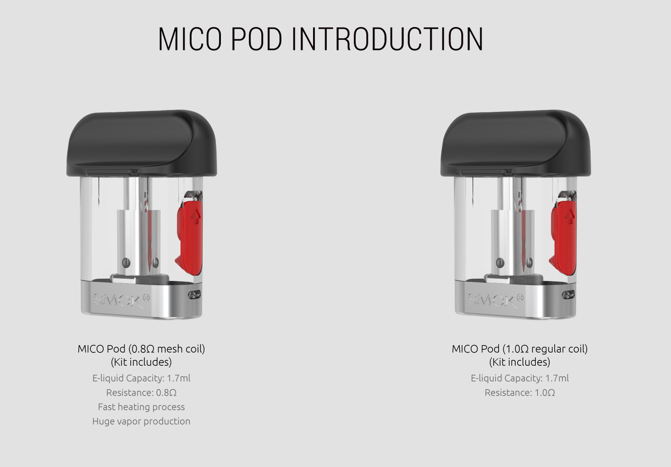 Smok Mico Pod Kit використовує змінні картриджі об'ємом 1,7 мл. У комплекті є два типи картриджів: