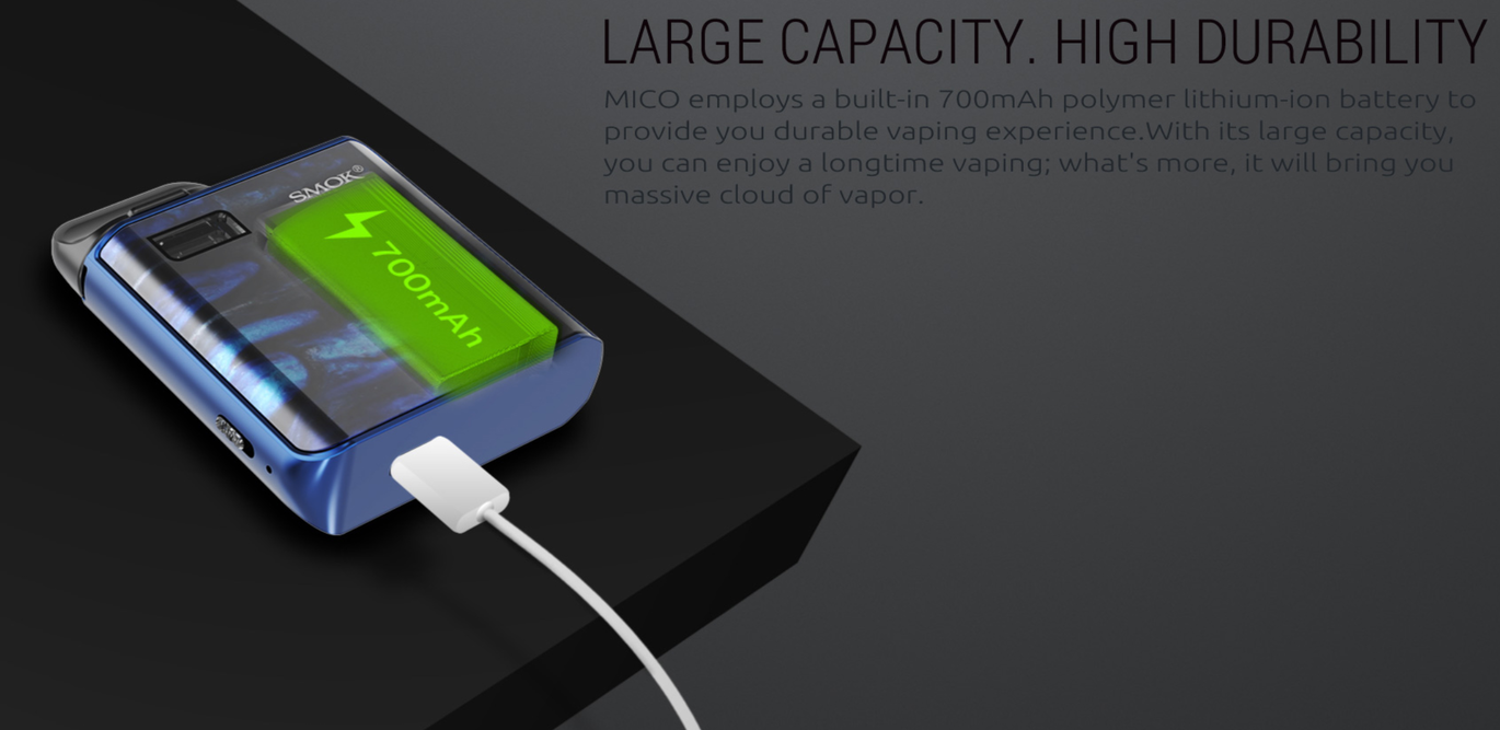 Вбудований акумулятор ємністю 700 мАг забезпечує тривалу автономну роботу. Завдяки такому запасу енергії, Smok Mico може працювати протягом усього дня без необхідності підзарядки. Заряджання здійснюється через micro-USB порт, а індикатор на корпусі відображає рівень заряду акумулятора.