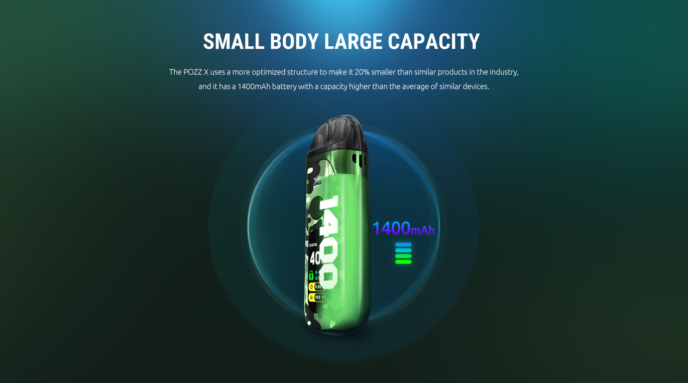 Pozz X оснащений вбудованим акумулятором ємністю 1400 мАг, що забезпечує тривалу роботу без необхідності частого заряджання. Пристрій підтримує регульовану потужність від 5 до 40 Вт, що дозволяє налаштувати його під індивідуальні потреби користувача. Заряджання здійснюється через порт Micro-USB.