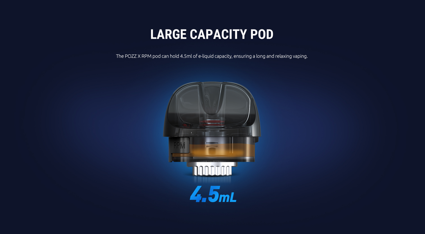 Smok Pozz X використовує змінні картриджі об'ємом 4,5 мл, що забезпечує тривале використання без необхідності частого поповнення рідини. Пристрій сумісний з усіма випарниками серії RPM, що дозволяє користувачам обирати між різними опорами для досягнення бажаного смаку та кількості пари.
