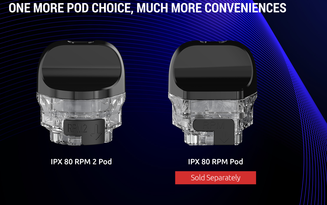 Smok IPX 80 Kit використовує змінні картриджі IPX 80 RPM 2 Pod з магнітним кріпленням. Вони мають об’єм 5.5 мл, що дозволяє довго насолоджуватися улюбленими рідинами без частих дозаправок. Картриджі сумісні з випарниками серії RPM 2, що дозволяє налаштовувати пристрій під власні вподобання: