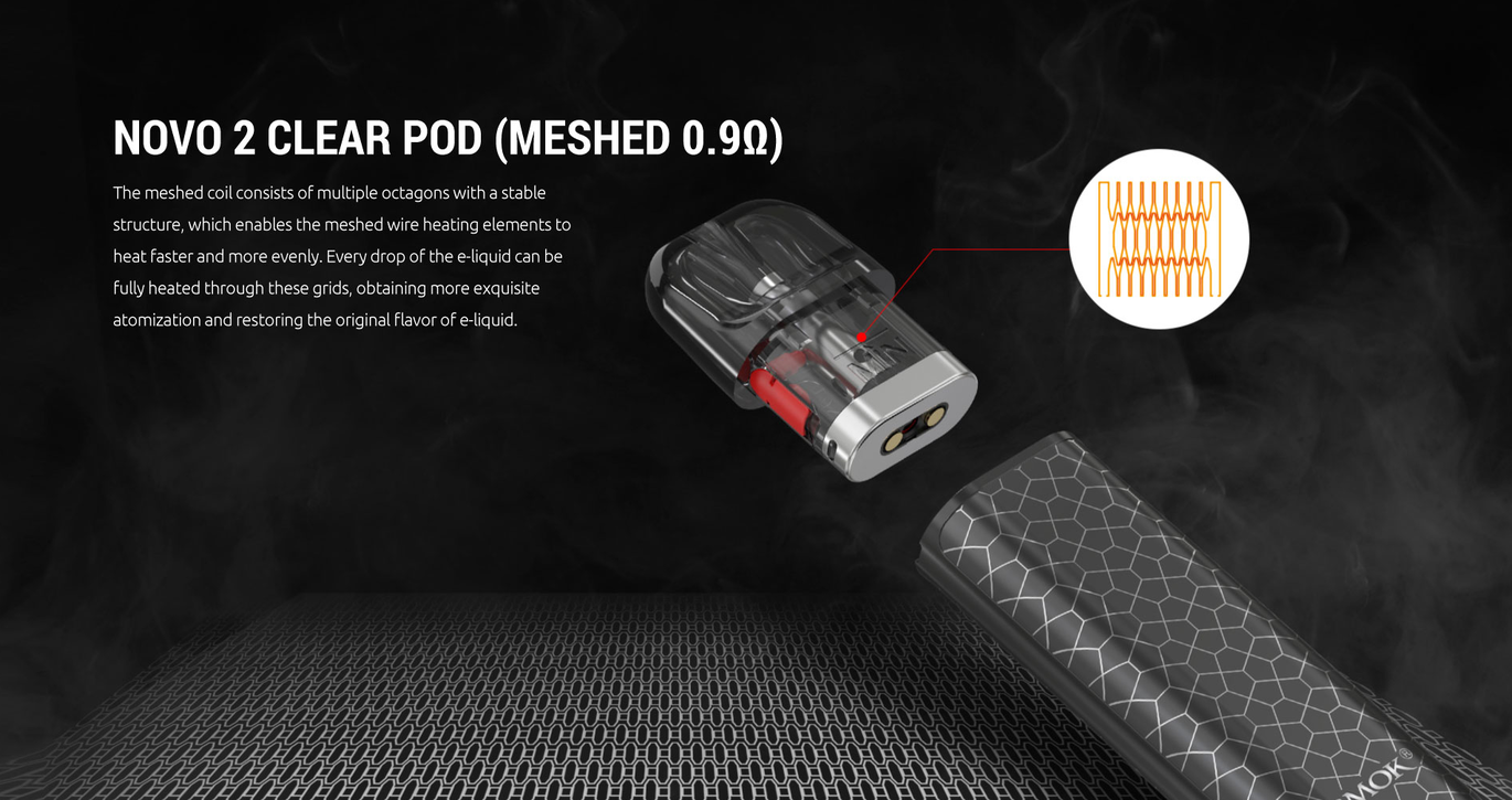 Smok Novo 2S Pod Kit використовує прозорі картриджі об’ємом 1,8 мл зі вбудованим сітчастим випарником. Завдяки технології Mesh Coil 0,9 Ом, пристрій чудово передає смак рідини та забезпечує плавну, насичену тягу. Заправка здійснюється через бічний отвір із силіконовою заглушкою, що запобігає протіканню.
