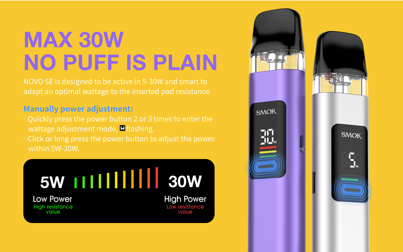Novo SE підтримує діапазон потужності від 5W до 30W, автоматично адаптуючи оптимальну потужність під встановлений картридж. Це гарантує стабільний нагрів і насичений смак при кожній затяжці: