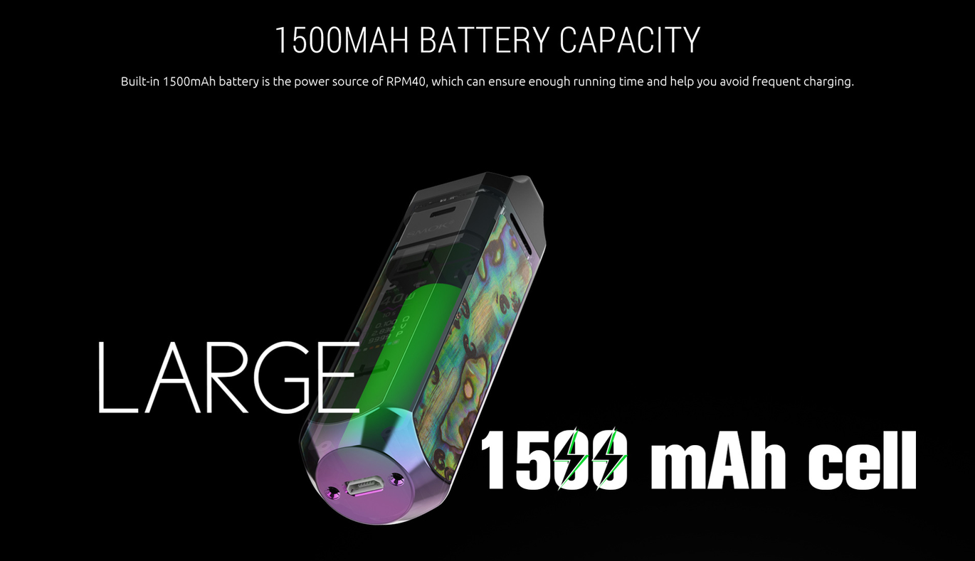 Smok RPM 40 оснащений вбудованим акумулятором ємністю 1500 мАг, що забезпечує тривалу роботу без необхідності частого заряджання. Пристрій підтримує регулювання потужності в діапазоні від 1 до 40 Вт, що дозволяє налаштувати його під індивідуальні потреби. Заряджання здійснюється через порт Micro-USB з максимальним струмом 0,88 А, що забезпечує повний заряд приблизно за 2 години.