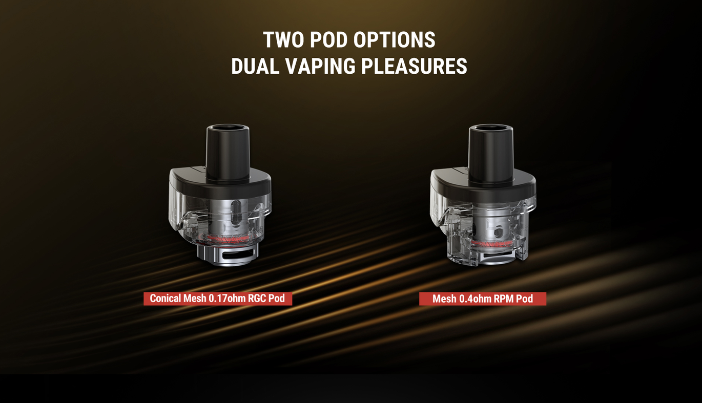 - RPM Pod: сумісний з усіма випарниками серії RPM, включаючи RPM Mesh 0,4Ω, який забезпечує насичений смак та велику кількість пари.