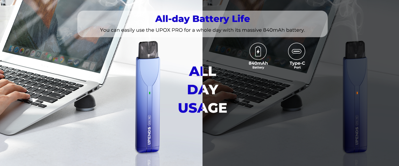 Upox Pro оснащений вбудованим акумулятором ємністю 840 мАг, що забезпечує тривалу роботу протягом дня. Заряджання здійснюється через порт USB Type-C, що забезпечує швидке та зручне відновлення заряду.