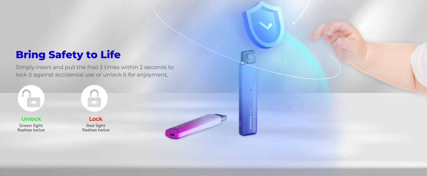 Окрім цього, pod-система Upox Pro має вбудовану систему захисту від дітей та випадкової активації. Щоб заблокувати або розблокувати пристрій, потрібно тричі поспіль вийняти та вставити картридж протягом двох секунд.