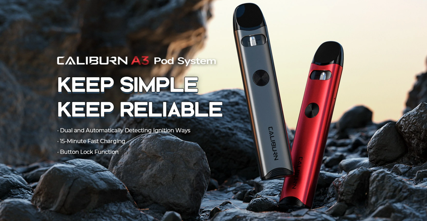 Caliburn A3 використовує перезаправні картриджі об'ємом 2 мл з вбудованими сітчастими випарниками FeCrAl опором 1,0 Ом. Заправка здійснюється через верхню частину картриджа, що забезпечує зручність та запобігає протіканню. Технологія PRO-FOCS Flavor Adjustment гарантує насичений та чистий смак під час паріння.