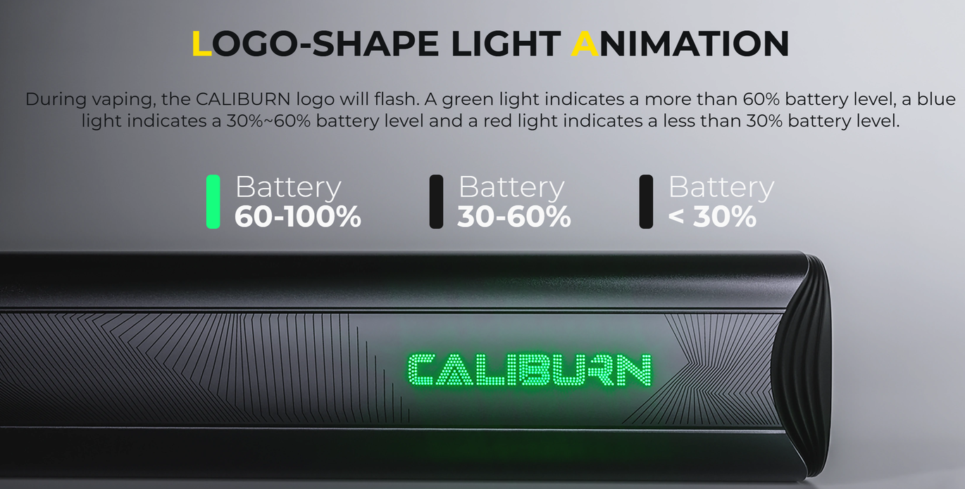 Логотип "Caliburn" на корпусі пристрою виконує функцію LED-індикатора, змінюючи колір залежно від рівня заряду батареї: