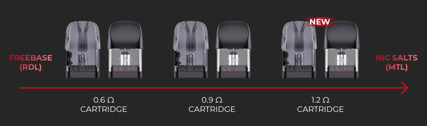 Гаджет використовує картриджі об'ємом 2,5 мл, які сумісні зі змінними випарниками серії Caliburn G3 Pods з опором 0,6 Ом та 0,9 Ом. Це дозволяє користувачам обрати оптимальний варіант для своїх потреб, забезпечуючи різні варіанти затяжки від MTL до RDTL. Картриджі мають зручну верхню заправку та систему регулювання повітряного потоку, що дозволяє налаштувати інтенсивність затяжки відповідно до вподобань користувача.