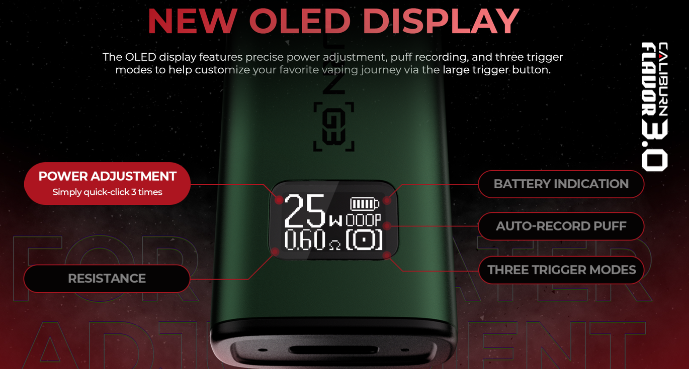 Однією з ключових особливостей Caliburn G3 є наявність OLED-дисплея, який відображає важливу інформацію для користувача, включаючи: