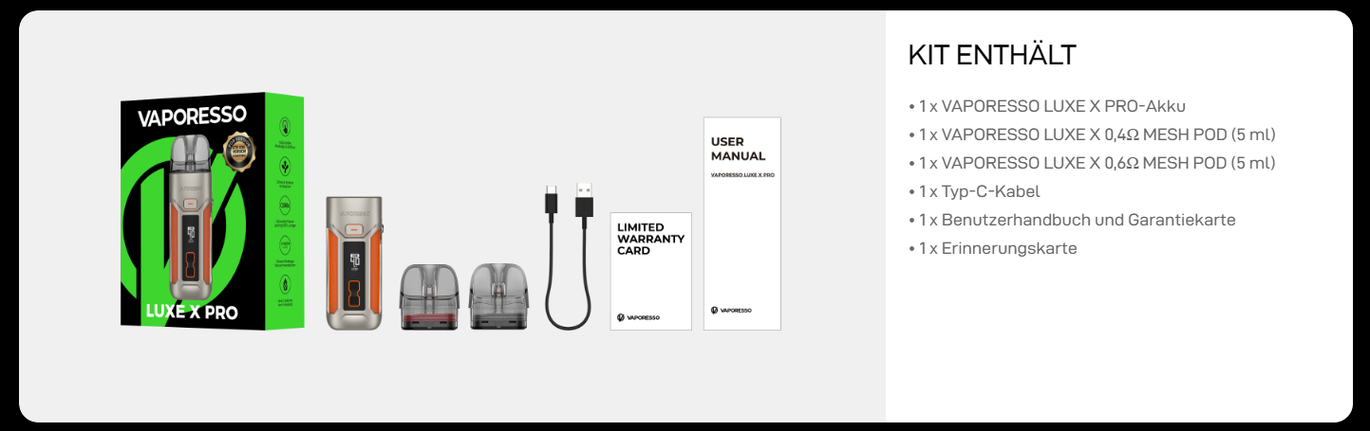 Vaporesso Luxe X Pro Kit 1500mAh — це інноваційна pod-система, яка обіцяє максимальне задоволення від вейпінгу завдяки безлічі високоякісних функцій. Цей девайс з серії популярних подів Вапорессо Люкс ідеально підходить як для досвідчених користувачів, так і для новачків. Завдяки покращеному дизайну та потужним характеристикам, він швидко завоював популярність серед поціновувачів якісного вейпінгу. У цьому огляді ми розповімо про всі особливості Luxe X Pro від бренду Vaporesso та його переваги.