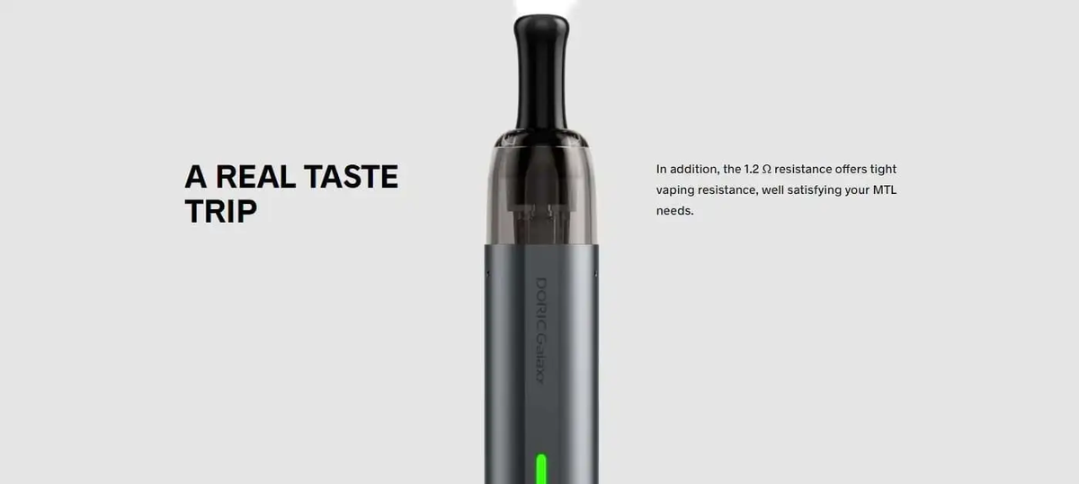 Doric Galaxy S1 вражає своїм мінімалістичним дизайном та компактними розмірами. Виконаний у форм-факторі стіку, цей гаджет зручно лежить у руці та легко поміщається в кишені. Автоматична активація затяжкою робить використання максимально простим та інтуїтивно зрозумілим – просто затягніться, і пристрій почне генерувати пару. Корпус з алюмінієвого сплаву забезпечує міцність та стильний зовнішній вигляд. Цей под, або ж под-система, розроблений для забезпечення якісного MTL-вейпінгу та задоволення від кожної затяжки.
