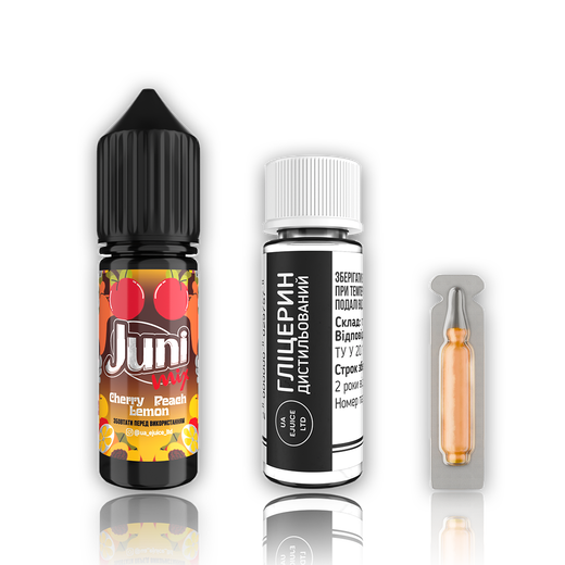 Склад набору: концентрований ароматизатор Cherry Peach Lemon, нікобустер із вмістом 50 мг сольового нікотину, гліцерин.