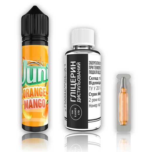Набір органічної рідини Juni Orange Mango (Апельсин Манго) 60 мл 6 мг — це яскравий і соковитий фруктовий мікс з насиченим смаком солодкого манго та свіжого апельсина. Смак розкривається свіжою цитрусовою ноткою апельсина, яка плавно переходить у солодку і м’яку солодкість манго. Ідеальний вибір для поціновувачів тропічних і цитрусових ароматів з балансом кислинки і солодкості.