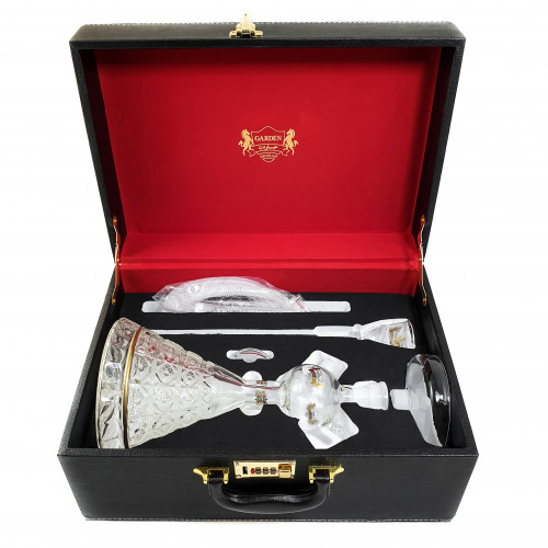 Скляний кальян Garden повністю виготовлений вручну з високоякісного боросилікатного скла, яке має підвищену стійкість до механічних пошкоджень та підвищену термостійкість. Поставляється в кейсі з еко-шкіри у комплекті з силіконовою трубкою. Компактний кальян розрахований на індивідуальне використання. Прекрасний варіант для подарунка. У цьому кальяні не використовуються металеві чи гумові з'єднання. Все збирається на скляних притираннях.
