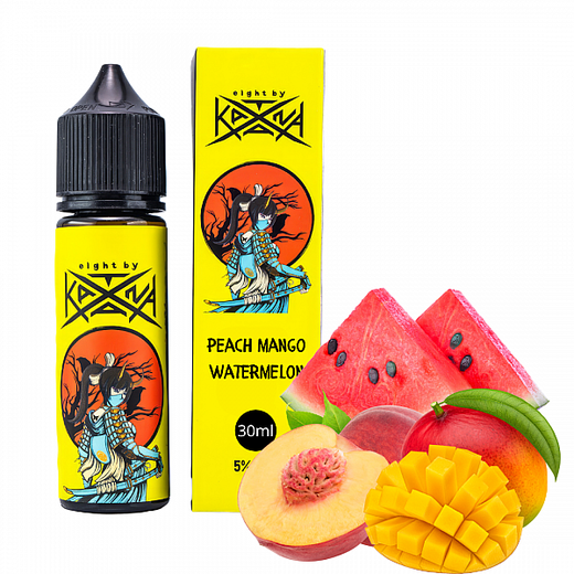 Рідина Katana Mango Peach Watermelon (Манго Персик Кавун) 30 мл 50 мг — це гармонійне поєднання соковитого манго, солодкого персика та освіжаючого кавуна. Цей тропічний мікс створює яскраві фруктові нотки, які дарують задоволення з кожною затяжкою.