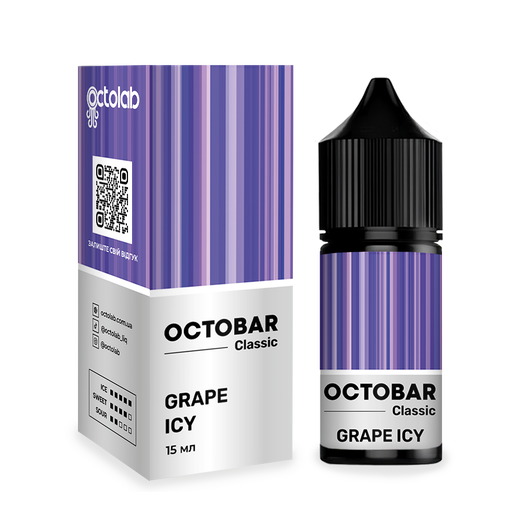 Набір сольової рідини Octobar Classic Grape Icy (Виноград Лід) 30 мл 50 мг — це яскравий, прохолодний мікс соковитого винограду з крижаним післясмаком. Насичений ягідний аромат розкривається з перших затяжок і залишається свіжим до останньої краплі. Такий смак чудово підійде тим, хто любить фруктові мікси з ефектом охолодження — без зайвої солодкавості.