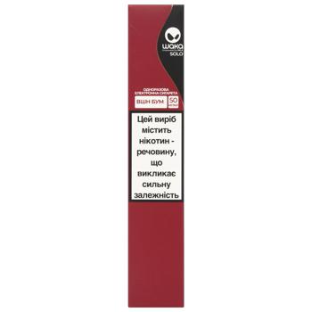 Одноразова електронна сигарета WAKA SOLO Вшн Бум (Вишневий Бум) 5% 5.5мл - це справжній вибух смаку. Смак на вдих яскравий і насичений, з глибоким присмаком вишні. Ніяких картриджів і заправки не потрібно - просто відкрийте упаковку і насолоджуйтеся.