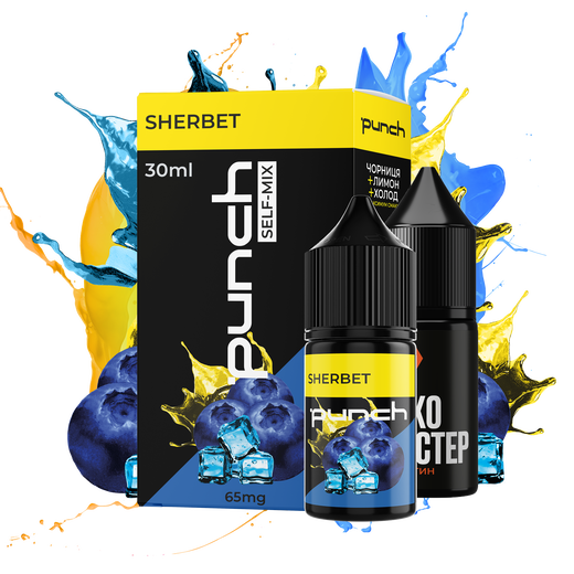 Набір сольової рідини Punch Sherbet (Чорниця Лимон) 30 мл 65 мг — це яскравий мікс стиглої чорниці та іскристого лимону, що створює ефект шипучого сорбету. Смак відкривається з солодких ягідних нот, а вже за мить відчувається освіжаюча лимонна іскра — соковито, збалансовано й по-справжньому барвисто.