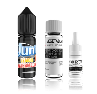 Увага! Це не готова рідина, а набір компонентів для її змішування. Просто додайте гліцерин та нікотин до ароматизатора і гарно струсіть флакон. Після цього можете парити.