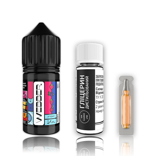 Набір рідини Webber Salt 30 мл - це ідеальний вибір для самостійного приготування сольової рідини для пода від перевіреного українського виробника UA E-Juice. Рідина випускається в пластикових флаконах об'ємом 30 мл з контролем першого відкриття. Яскрава етикетка з впізнаваним дизайном містить абстрактні зображення, що натякають на ключові інгредієнти, а чіткі написи в правому верхньому кутку інформують про процентне співвідношення ароматизаторів.