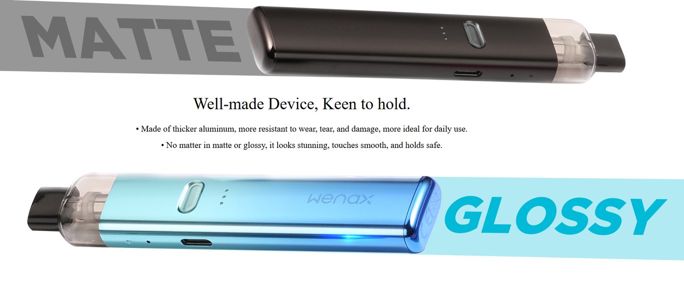 Дизайн Geekvape Wenax K2 — изысканный и стильный. Корпус выполнен из алюминиевого сплава, что делает Pod легким (всего 45 г) и прочным. Эргономичная форма и мягкие изгибы корпуса обеспечивают комфорт при использовании.