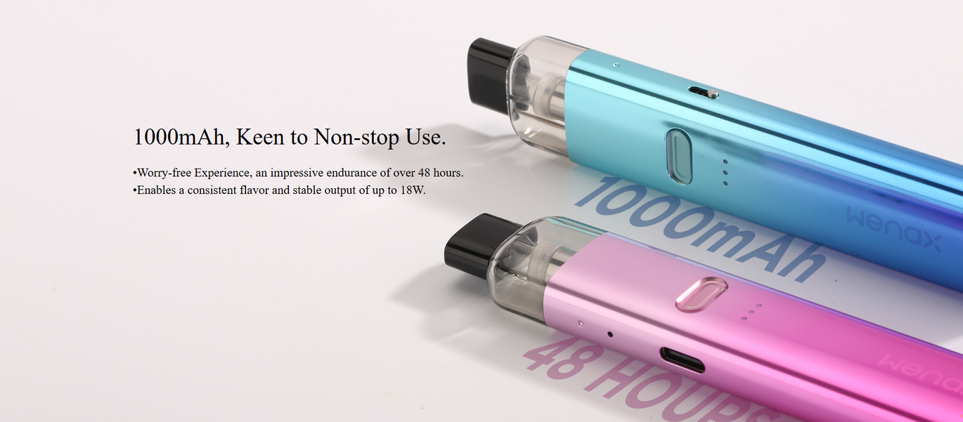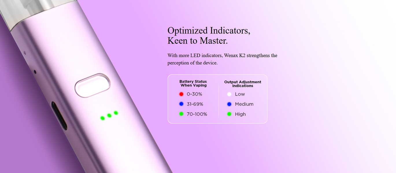 Wenax K2 предлагает широкий спектр функций, ориентированных на удобство пользователя. Технология постоянной выходной мощности обеспечивает стабильный опыт вейпинга, даже когда заряд аккумулятора снижается. Верхняя заправка картриджа предотвращает протекание жидкости, а легкий вес девайса позволяет носить его с собой весь день без дискомфорта.