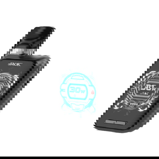На передній панелі розташований великий екран, який відображає ключову інформацію: рівень заряду, потужність, опір і статус блокування. Дві кнопки керування знаходяться під екраном, а кнопка Power розташована збоку, що забезпечує зручність використання.