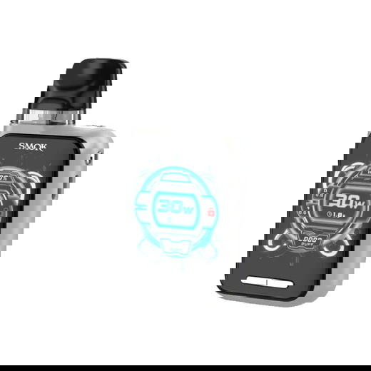 На передній панелі розташований великий екран, який відображає основну інформацію: потужність, рівень заряду, опір і статус блокування. Для зручного керування підом під екраном знаходяться дві кнопки, а кнопка Power розташована на боковій грані, забезпечуючи легкий доступ.