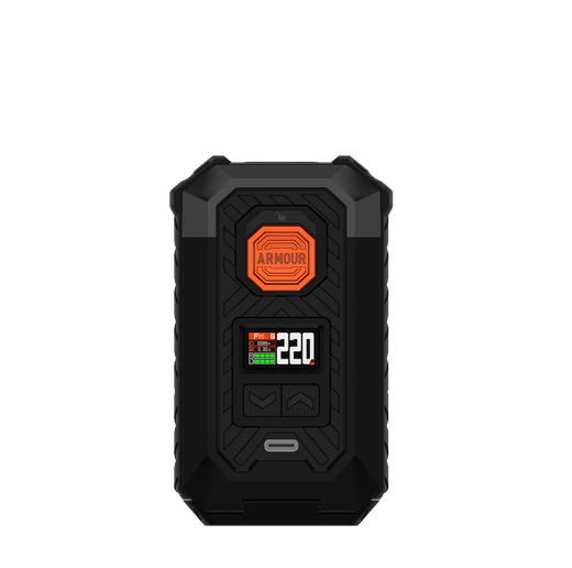 Vaporesso Armour Max Black — потужний і надійний бокс мод з міцним корпусом з TPU-матеріалу в класичному чорному кольорі, що забезпечує захист від ударів і подряпин. Пристрій працює на двох акумуляторах типу 18650 або 21700 (не входять у комплект), розвиваючи максимальну потужність до 220 Вт. Оснащений яскравим 0.96" кольоровим TFT-дисплеєм та зручним керуванням за допомогою трьох кнопок.