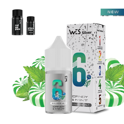 Набір сольової рідини WES Silver Candy & Mint (М'ятні цукерки) 30 мл 65 мг — це яскравий мікс ментолової свіжості та карамельної солодкості. М'ята освіжає, а цукерковий підтекст додає м’якості та приємного солодкого шлейфу. Такий смак чудово підходить для щоденного паріння, особливо для поціновувачів прохолодних, але не надто різких ароматів.